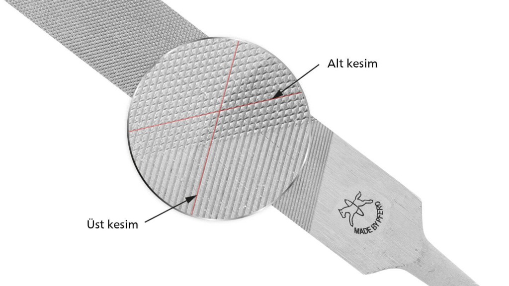 Kesim, eğe ucuna bölünen kesim sayısının tanımıdır. Tekli kesim, çapraz kesim ve raspa kesim arasında bir ayrım yapılır. Çapraz kesim halinde alt kesim ve daha sonra üst kesim oluşturulur, çapraz desen elde edilir.